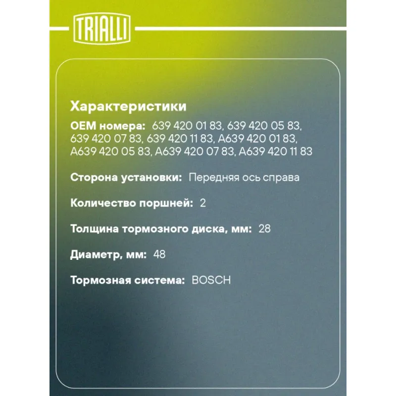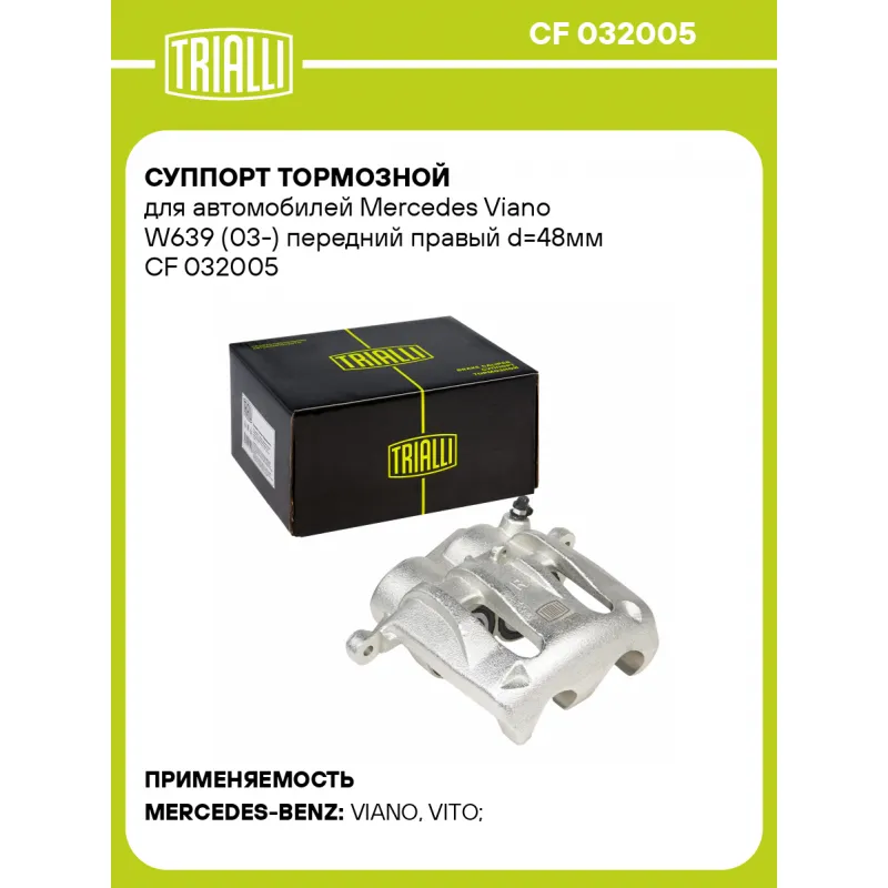 Суппорт тормозной для автомобилей Mercedes Viano W639 (03-) передний правый d=48мм Характеристики: Артикул: CF 032005 OEM номера: 639 420 01 83, 639 420 05 83, 639 420 07 83, 639 420 11 83, A639 420 01 83, A639 420 05 83, A639 420 07 83, A639 420 11 83 Гарантийный срок: 2 года / 60 000 км Сопутствующий товар: Ремкомплект суппорта: RCF 032005 Сопутствующий товар: Поршень суппорта: RCF 032005P Сопутствующий товар: Скоба суппорта: CF 190620 Сопутствующий товар: Суппорт тормозной: CF 032004 Парный товар: CF 032004 Количество на автомобиль: 1 Диаметр, мм: 48 Количество поршней: 2 Толщина тормозного диска, мм: 28 Тормозная система: BOSCH Сторона установки: Передняя ось справа Товарная линейка: BLACK Комплектация: Скоба дискового тормозного механизма (суппорт тормозной без направляющей колодок) - 1 шт Гарантия: от 1 года.