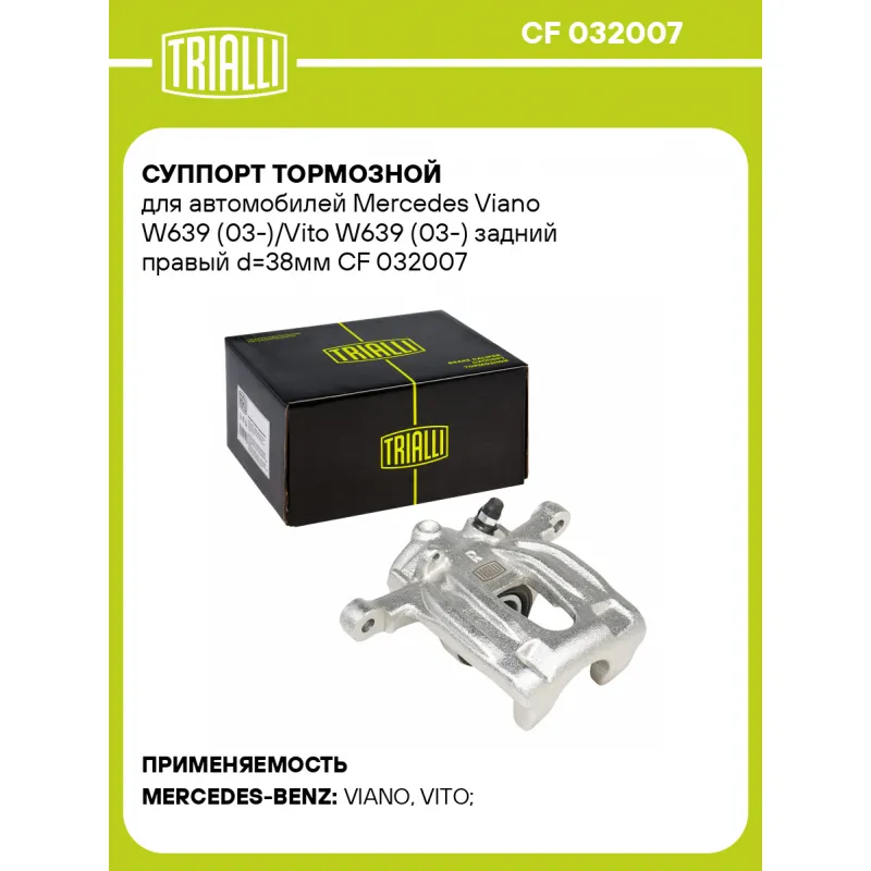 Суппорт тормозной для автомобилей Mercedes Viano W639 (03-)/Vito W639 (03-) задний правый d=38мм Характеристики: Артикул: CF 032007 OEM номера: 639 420 03 83, 639 420 09 83, A639 420 03 83, A639 420 09 83 Гарантийный срок: 2 года / 60 000 км Сопутствующий товар: Ремкомплект суппорта: RCF 032007 Сопутствующий товар: Поршень суппорта: RCF 032007P Сопутствующий товар: Скоба суппорта: CF 190618 Сопутствующий товар: Суппорт тормозной: CF 032006 Парный товар: CF 032006 Количество на автомобиль: 1 Диаметр, мм: 38 Количество поршней: 1 Толщина тормозного диска, мм: 10 Тормозная система: BOSCH Сторона установки: Задняя ось справа Товарная линейка: BLACK Комплектация: Скоба дискового тормозного механизма (суппорт тормозной без направляющей колодок) - 1 шт Гарантия: от 1 года.