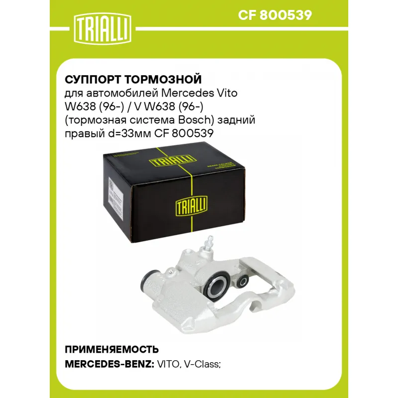 Суппорт тормозной для автомобилей Mercedes Vito W638 (96-) / V W638 (96-) (тормозная система Bosch) задний правый d=33мм Характеристики: Артикул: CF 800539 OEM номера: 001 420 65 83, A001 420 65 83 Тормозная система: BOSCH Диаметр, мм: 33 Гарантийный срок: 2 года / 60 000 км Количество поршней: 1 Толщина тормозного диска, мм: 10 Сторона установки: Задняя ось справа Сопутствующий товар: Ремкомплект суппорта: RCF 800538 Сопутствующий товар: Поршень суппорта: RCF 800539 Сопутствующий товар: Скоба суппорта: CF 800540 Сопутствующий товар: Суппорт тормозной: CF 800538 Парный товар: CF 800538 Количество на автомобиль: 1 Товарная линейка: BLACK Комплектация: Скоба дискового тормозного механизма (суппорт тормозной без направляющей колодок) - 1 шт Гарантия: от 1 года.