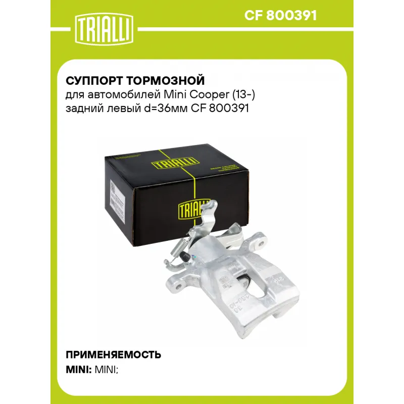 Суппорт тормозной для автомобилей Mini Cooper (13-) задний левый d=36мм Характеристики: Артикул: CF 800391 OEM номера: 34 21 6 860 557, 34 21 6 865 655 Тормозная система: MANDO Диаметр, мм: 36 Гарантийный срок: 2 года / 60 000 км Количество поршней: 1 Толщина тормозного диска, мм: 10 Сторона установки: Задняя ось слева Сопутствующий товар: Ремкомплект суппорта: RCF 800391 Сопутствующий товар: Поршень суппорта: RCF 800392 Сопутствующий товар: Скоба суппорта: CF 800393 Сопутствующий товар: Суппорт тормозной: CF 800392 Парный товар: CF 800392 Количество на автомобиль: 1 Товарная линейка: BLACK Комплектация: Скоба дискового тормозного механизма (суппорт тормозной без направляющей колодок) - 1 шт Гарантия: от 1 года.