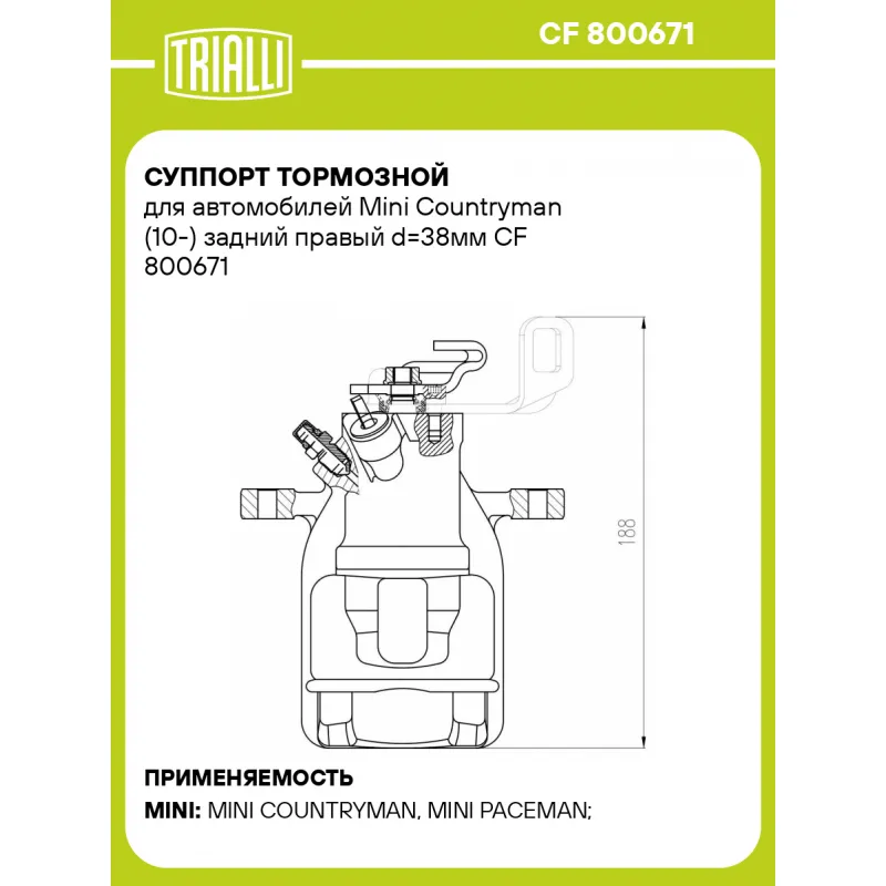Суппорт тормозной для автомобилей Mini Countryman (10-) задний правый d=38мм Характеристики: Артикул: CF 800671 OEM номера: 34 21 9 804 732 Тормозная система: TRW Диаметр, мм: 38 Гарантийный срок: 2 года / 60 000 км Количество поршней: 1 Толщина тормозного диска, мм: 10 Сторона установки: Задняя ось справа Сопутствующий товар: Ремкомплект суппорта: RCF 800670 Сопутствующий товар: Поршень суппорта: RCF 800671 Сопутствующий товар: Скоба суппорта: CF 800672 Сопутствующий товар: Суппорт тормозной: CF 800670 Диаметр тормозного диска, мм: 280 Парный товар: CF 800670 Количество на автомобиль: 1 Товарная линейка: BLACK Комплектация: Скоба дискового тормозного механизма (суппорт тормозной без направляющей колодок) - 1 шт Гарантия: от 1 года.