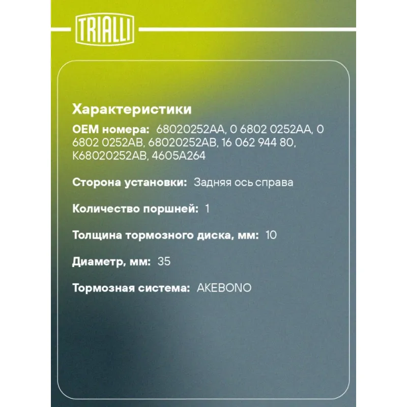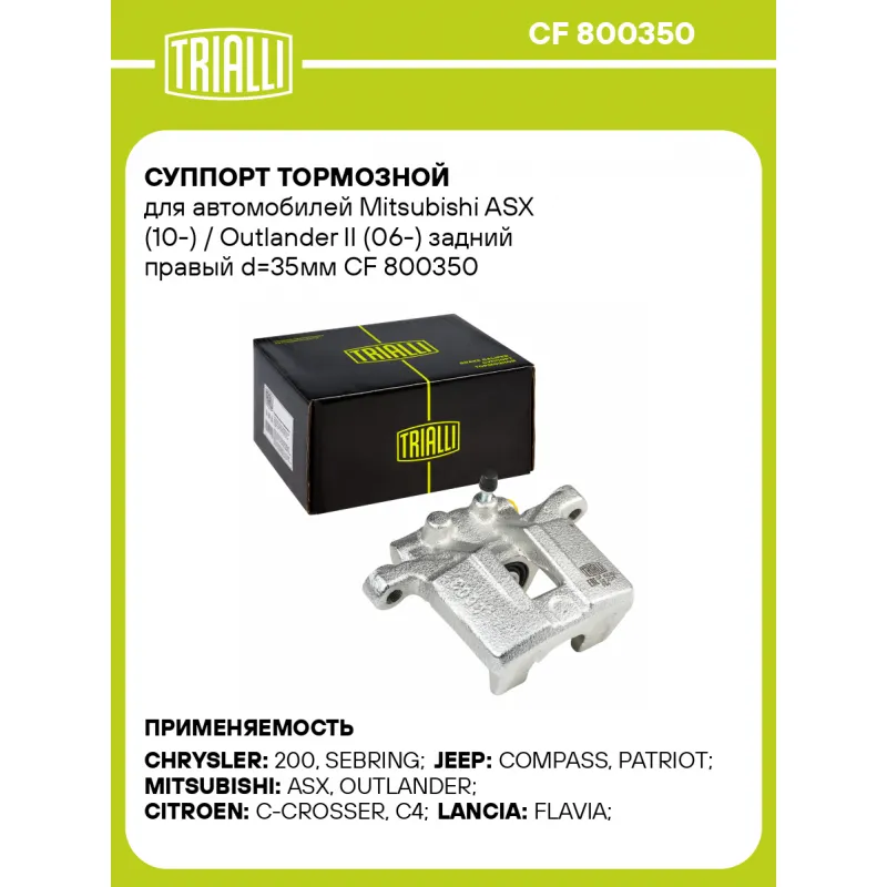 Суппорт тормозной для автомобилей Mitsubishi ASX (10-) / Outlander II (06-) задний правый d=35мм Характеристики: Артикул: CF 800350 OEM номера: 68020252AA, 0 6802 0252AA, 0 6802 0252AB, 68020252AB, 16 062 944 80, K68020252AB, 4605A264 Тормозная система: AKEBONO Диаметр, мм: 35 Гарантийный срок: 2 года / 60 000 км Количество поршней: 1 Толщина тормозного диска, мм: 10 Сторона установки: Задняя ось справа Сопутствующий товар: Ремкомплект суппорта: RCF 800349 Сопутствующий товар: Поршень суппорта: RCF 800350 Сопутствующий товар: Скоба суппорта: CF 800351 Сопутствующий товар: Суппорт тормозной: CF 800349 Парный товар: CF 800349 Количество на автомобиль: 1 Товарная линейка: BLACK Комплектация: Скоба дискового тормозного механизма (суппорт тормозной без направляющей колодок) - 1 шт Гарантия: от 1 года.