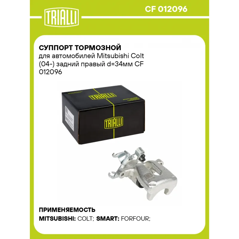 Суппорт тормозной для автомобилей Mitsubishi Colt (04-) задний правый d=34мм Характеристики: Артикул: CF 012096 OEM номера: 4605A074, 454 420 08 01 Гарантийный срок: 2 года / 60 000 км Сопутствующий товар: Ремкомплект суппорта: RCF 012096 Сопутствующий товар: Поршень суппорта: RCF 012095 Сопутствующий товар: Скоба суппорта: CF 350126 Сопутствующий товар: Суппорт тормозной: CF 012095 Парный товар: CF 012095 Количество на автомобиль: 1 Диаметр, мм: 34 Количество поршней: 1 Толщина тормозного диска, мм: 10 Тормозная система: TRW Сторона установки: Задняя ось справа Товарная линейка: BLACK Комплектация: Скоба дискового тормозного механизма (суппорт тормозной без направляющей колодок) - 1 шт Гарантия: от 1 года.