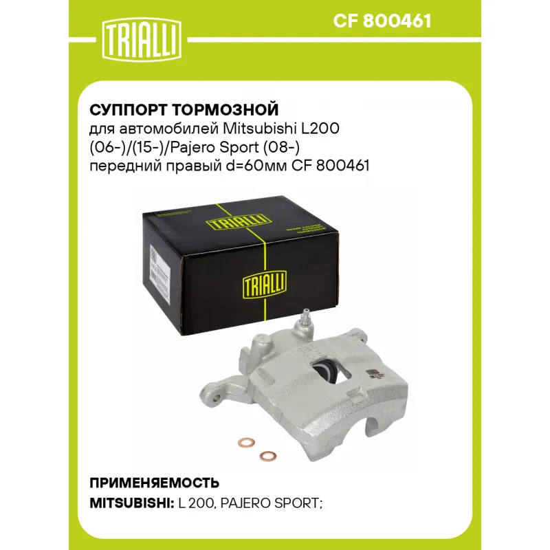 Суппорт тормозной для автомобилей Mitsubishi L200 (06-)/(15-)/Pajero Sport (08-) передний правый d=60мм Характеристики: Артикул: CF 800461 OEM номера: 4605A202 Тормозная система: TOKICO Диаметр, мм: 60 Гарантийный срок: 2 года / 60 000 км Количество поршней: 1 Толщина тормозного диска, мм: 28 Сторона установки: Передняя ось справа Сопутствующий товар: Ремкомплект суппорта: RCF 800460 Сопутствующий товар: Поршень суппорта: RCF 800461 Сопутствующий товар: Скоба суппорта: CF 800462 Сопутствующий товар: Суппорт тормозной: CF 800460 Парный товар: CF 800460 Количество на автомобиль: 1 Товарная линейка: BLACK Комплектация: Скоба дискового тормозного механизма (суппорт тормозной без направляющей колодок) - 1 шт Гарантия: от 1 года.