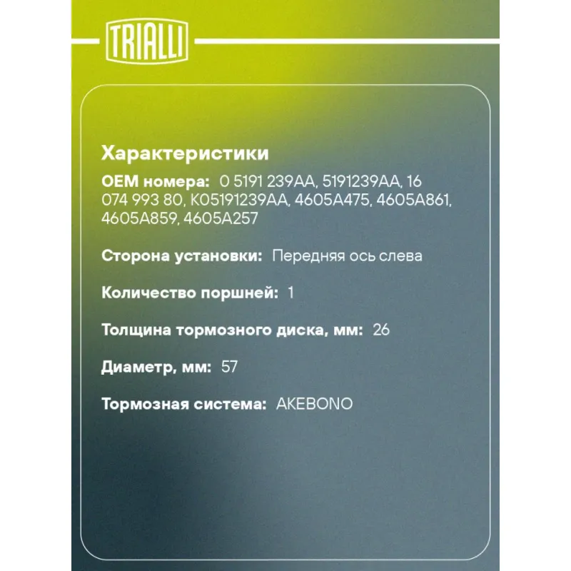 Суппорт тормозной для автомобилей Mitsubishi Lancer IX (03-) / ASX (10-) / Outlander III (12-) передний левый d=57мм Характеристики: Артикул: CF 800343 OEM номера: 0 5191 239AA, 5191239AA, 16 074 993 80, K05191239AA, 4605A475, 4605A861, 4605A859, 4605A257 Тормозная система: AKEBONO Диаметр, мм: 57 Гарантийный срок: 2 года / 60 000 км Количество поршней: 1 Толщина тормозного диска, мм: 26 Сторона установки: Передняя ось слева Сопутствующий товар: Ремкомплект суппорта: RCF 800343 Сопутствующий товар: Поршень суппорта: RCF 800344 Сопутствующий товар: Скоба суппорта: CF 800345 Сопутствующий товар: Суппорт тормозной: CF 800344 Парный товар: CF 800344 Количество на автомобиль: 1 Товарная линейка: BLACK Комплектация: Скоба дискового тормозного механизма (суппорт тормозной без направляющей колодок) - 1 шт Гарантия: от 1 года.
