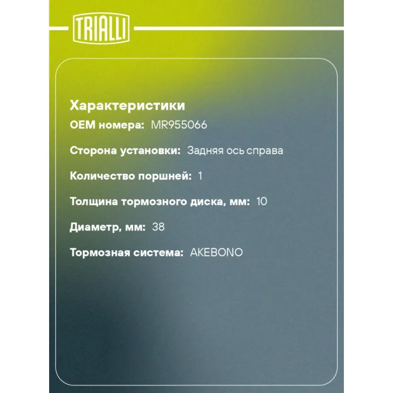 Суппорт тормозной для автомобилей Mitsubishi Lancer IX (03-) / Outlander I (03-) / II (06-) задний правый d=38мм Характеристики: Артикул: CF 800347 OEM номера: MR955066 Тормозная система: AKEBONO Диаметр, мм: 38 Гарантийный срок: 2 года / 60 000 км Количество поршней: 1 Толщина тормозного диска, мм: 10 Сторона установки: Задняя ось справа Сопутствующий товар: Ремкомплект суппорта: RCF 800346 Сопутствующий товар: Поршень суппорта: RCF 800347 Сопутствующий товар: Скоба суппорта: CF 800348 Сопутствующий товар: Суппорт тормозной: CF 800346 Парный товар: CF 800346 Количество на автомобиль: 1 Товарная линейка: BLACK Комплектация: Скоба дискового тормозного механизма (суппорт тормозной без направляющей колодок) - 1 шт Гарантия: от 1 года.