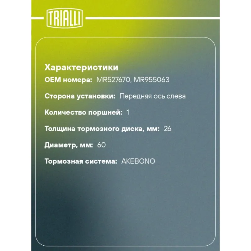 Суппорт тормозной для автомобилей Mitsubishi Lancer IX (03-) передний левый d=60мм Характеристики: Артикул: CF 800511 OEM номера: MR527670, MR955063 Тормозная система: AKEBONO Диаметр, мм: 60 Гарантийный срок: 2 года / 60 000 км Количество поршней: 1 Толщина тормозного диска, мм: 26 Сторона установки: Передняя ось слева Сопутствующий товар: Ремкомплект суппорта: RCF 800511 Сопутствующий товар: Поршень суппорта: RCF 800512 Сопутствующий товар: Скоба суппорта: CF 800513 Сопутствующий товар: Суппорт тормозной: CF 800512 Парный товар: CF 800512 Количество на автомобиль: 1 Товарная линейка: BLACK Комплектация: Скоба дискового тормозного механизма (суппорт тормозной без направляющей колодок) - 1 шт Гарантия: от 1 года.