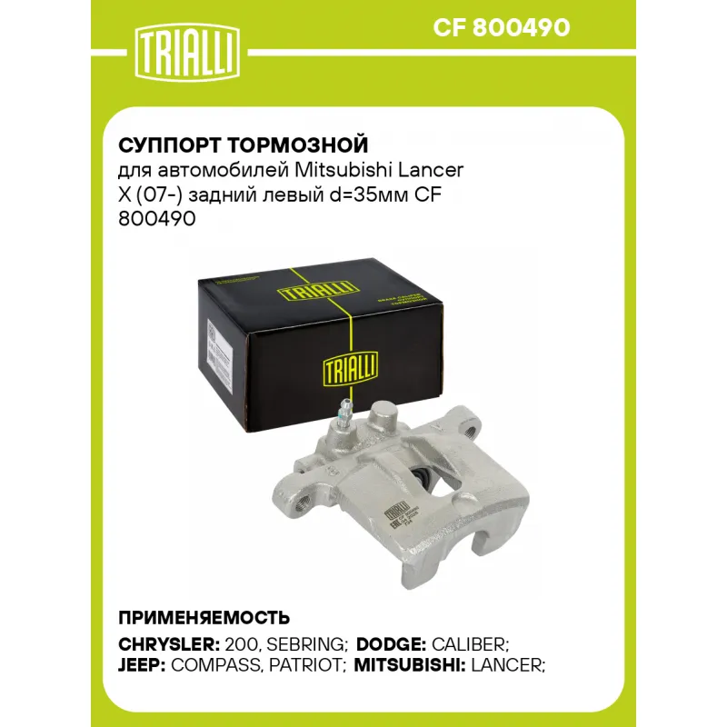 Суппорт тормозной для автомобилей Mitsubishi Lancer X (07-) задний левый d=35мм Характеристики: Артикул: CF 800490 OEM номера: 05191267AA, 5191267AA, K05191267AA, 4605A477 Тормозная система: AKEBONO Диаметр, мм: 35 Гарантийный срок: 2 года / 60 000 км Количество поршней: 1 Толщина тормозного диска, мм: 10 Сторона установки: Задняя ось слева Сопутствующий товар: Ремкомплект суппорта: RCF 800490 Сопутствующий товар: Поршень суппорта: RCF 800491 Сопутствующий товар: Скоба суппорта: CF 800492 Сопутствующий товар: Суппорт тормозной: CF 800491 Парный товар: CF 800491 Количество на автомобиль: 1 Товарная линейка: BLACK Комплектация: Скоба дискового тормозного механизма (суппорт тормозной без направляющей колодок) - 1 шт Гарантия: от 1 года.