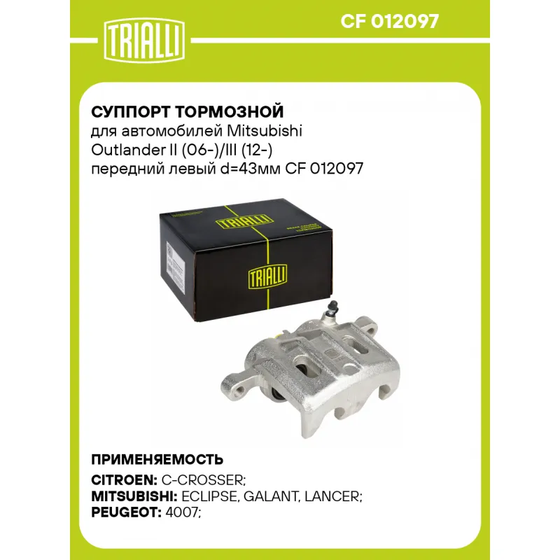 Суппорт тормозной для автомобилей Mitsubishi Outlander II (06-)/III (12-) передний левый d=43мм Характеристики: Артикул: CF 012097 OEM номера: 4400 T9, AW349945, MB950176, MR249964, MR370775 Гарантийный срок: 2 года / 60 000 км Сопутствующий товар: Ремкомплект суппорта: RCF 012097 Сопутствующий товар: Поршень суппорта: RCF 012098 Сопутствующий товар: Скоба суппорта: CF 550124 Сопутствующий товар: Суппорт тормозной: CF 012098 Парный товар: CF 012098 Количество на автомобиль: 1 Диаметр, мм: 43 Количество поршней: 2 Толщина тормозного диска, мм: 24 Тормозная система: AKEBONO Сторона установки: Передняя ось слева Товарная линейка: BLACK Комплектация: Скоба дискового тормозного механизма (суппорт тормозной без направляющей колодок) - 1 шт Гарантия: от 1 года.