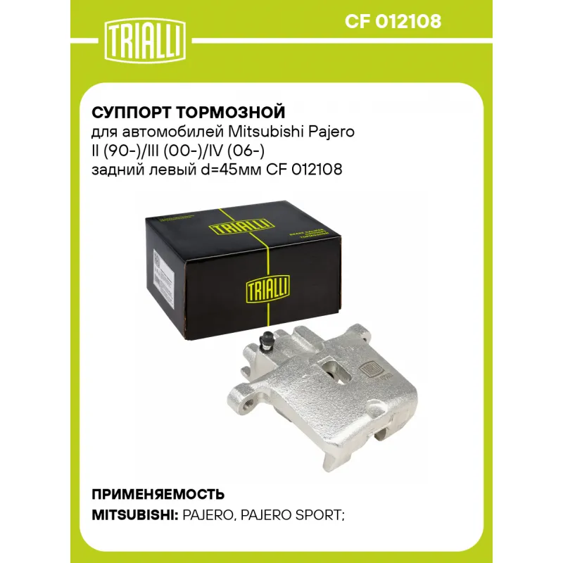 Суппорт тормозной для автомобилей Mitsubishi Pajero II (90-)/III (00-)/IV (06-) задний левый d=45мм Характеристики: Артикул: CF 012108 OEM номера: MR510541 Гарантийный срок: 2 года / 60 000 км Сопутствующий товар: Ремкомплект суппорта: RCF 012009 Сопутствующий товар: Поршень суппорта: RCF 012009P Сопутствующий товар: Скоба суппорта: CF 800966 Сопутствующий товар: Суппорт тормозной: CF 012109 Парный товар: CF 012109 Количество на автомобиль: 1 Диаметр, мм: 45 Количество поршней: 1 Толщина тормозного диска, мм: 22 Тормозная система: AKEBONO Сторона установки: Задняя ось слева Товарная линейка: BLACK Комплектация: Скоба дискового тормозного механизма (суппорт тормозной без направляющей колодок) - 1 шт Гарантия: от 1 года.