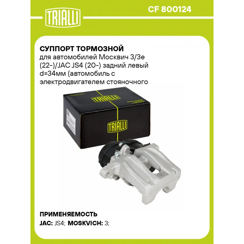 Суппорт тормозной для автомобилей Москвич 3/3e (22-)/JAC JS4 (20-) задний левый d=34мм (автомобиль с электродвигателем стояночного тормоза) Характеристики: Артикул: CF 800124 OEM номера: 3500700U3400F011 Особенности конструкции:: Для автомобилей с электрическим стояночным тормозом Диаметр, мм: 34 Гарантийный срок: 2 года / 60 000 км Количество поршней: 1 Сторона установки: Задняя ось слева Сопутствующий товар: Ремкомплект суппорта: RCF 800124 Сопутствующий товар: Поршень суппорта: RCF 800125 Сопутствующий товар: Скоба суппорта: CF 800126 Сопутствующий товар: Электродвигатель суппорта: RCM 800126 Сопутствующий товар: Суппорт тормозной: CF 800125 Парный товар: CF 800125 Количество на автомобиль: 1 Товарная линейка: BLACK Комплектация: Скоба дискового тормозного механизма (суппорт тормозной без направляющей колодок) - 1 шт Гарантия: от 1 года.
