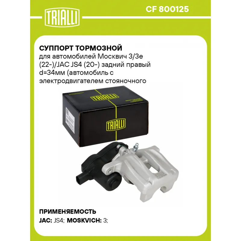Суппорт тормозной для автомобилей Москвич 3/3e (22-)/JAC JS4 (20-) задний правый d=34мм (автомобиль с электродвигателем стояночного тормоза) Характеристики: Артикул: CF 800125 OEM номера: 3500800U3400F011 Особенности конструкции:: Для автомобилей с электрическим стояночным тормозом Диаметр, мм: 34 Гарантийный срок: 2 года / 60 000 км Количество поршней: 1 Сторона установки: Задняя ось справа Сопутствующий товар: Ремкомплект суппорта: RCF 800124 Сопутствующий товар: Поршень суппорта: RCF 800125 Сопутствующий товар: Скоба суппорта: CF 800126 Сопутствующий товар: Электродвигатель суппорта: RCM 800126 Сопутствующий товар: Суппорт тормозной: CF 800124 Парный товар: CF 800124 Количество на автомобиль: 1 Товарная линейка: BLACK Комплектация: Скоба дискового тормозного механизма (суппорт тормозной без направляющей колодок) - 1 шт Гарантия: от 1 года.