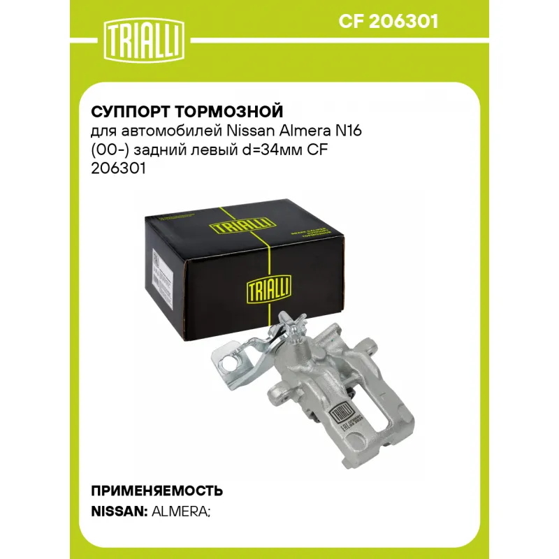 Суппорт тормозной для автомобилей Nissan Almera N16 (00-) задний левый d=34мм Характеристики: Артикул: CF 206301 OEM номера: 44011 BM500, 44011-BM50A Тормозная система: TRW Диаметр, мм: 34 Гарантийный срок: 2 года / 60 000 км Количество поршней: 1 Толщина тормозного диска, мм: 10 Сторона установки: Задняя ось слева Сопутствующий товар: Ремкомплект суппорта: RCF 206301 Сопутствующий товар: Поршень суппорта: RCF 206302 Сопутствующий товар: Скоба суппорта: CF 206303 Сопутствующий товар: Суппорт тормозной: CF 206302 Парный товар: CF 206302 Количество на автомобиль: 1 Товарная линейка: BLACK Комплектация: Скоба дискового тормозного механизма (суппорт тормозной без направляющей колодок) - 1 шт Гарантия: от 1 года.