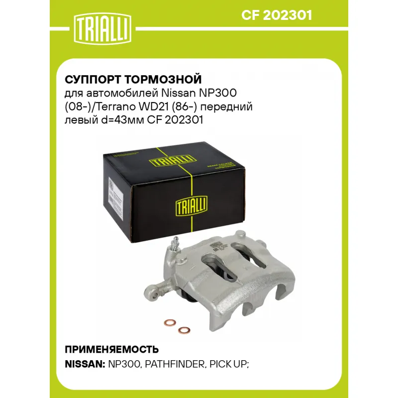 Суппорт тормозной для автомобилей Nissan NP300 (08-)/Terrano WD21 (86-) передний левый d=43мм Характеристики: Артикул: CF 202301 OEM номера: 41011 10G01, 41011 57G00, 41011 10G02, 41011 VL30A, 41011 VJ500 Тормозная система: NISSAN Диаметр, мм: 43 Гарантийный срок: 2 года / 60 000 км Количество поршней: 2 Толщина тормозного диска, мм: 26 Сторона установки: Передняя ось слева Парный товар: CF 202302 Количество на автомобиль: 1 Товарная линейка: BLACK Комплектация: Скоба дискового тормозного механизма (суппорт тормозной без направляющей колодок) - 1 шт Гарантия: от 1 года.