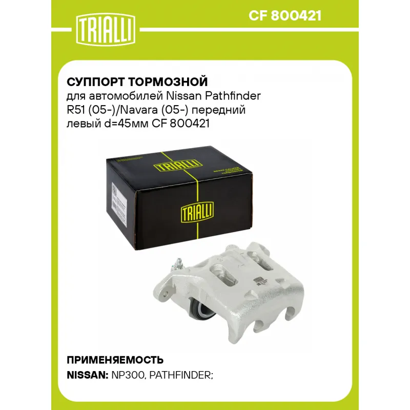 Суппорт тормозной для автомобилей Nissan Pathfinder R51 (05-)/Navara (05-) передний левый d=45мм Характеристики: Артикул: CF 800421 OEM номера: 41011 EB32A, 41011 ZS60A Тормозная система: NISSAN Диаметр, мм: 45 Гарантийный срок: 2 года / 60 000 км Количество поршней: 2 Толщина тормозного диска, мм: 28 Сторона установки: Передняя ось слева Сопутствующий товар: Ремкомплект суппорта: RCF 800421 Сопутствующий товар: Поршень суппорта: RCF 800422 Сопутствующий товар: Скоба суппорта: CF 800423 Сопутствующий товар: Суппорт тормозной: CF 800422 Диаметр тормозного диска, мм: 320 Парный товар: CF 800422 Количество на автомобиль: 1 Товарная линейка: BLACK Комплектация: Скоба дискового тормозного механизма (суппорт тормозной без направляющей колодок) - 1 шт Гарантия: от 1 года.
