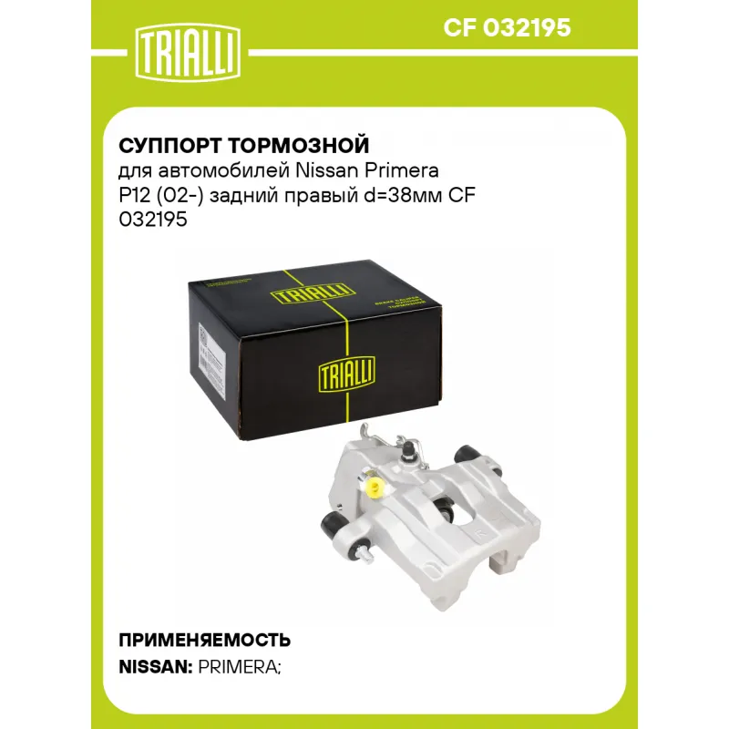 Суппорт тормозной для автомобилей Nissan Primera P12 (02-) задний правый d=38мм Характеристики: Артикул: CF 032195 OEM номера: 44001 AV700, 44001-BA00B Гарантийный срок: 2 года / 60 000 км Сопутствующий товар: Ремкомплект суппорта: RCF 032195 Сопутствующий товар: Поршень суппорта: RCF 032195P Сопутствующий товар: Скоба суппорта: CF 800968 Сопутствующий товар: Суппорт тормозной: CF 032194 Парный товар: CF 032194 Количество на автомобиль: 1 Диаметр, мм: 38 Количество поршней: 1 Толщина тормозного диска, мм: 10 Тормозная система: ATE Сторона установки: Задняя ось справа Товарная линейка: BLACK Комплектация: Скоба дискового тормозного механизма (суппорт тормозной без направляющей колодок) - 1 шт Гарантия: от 1 года.