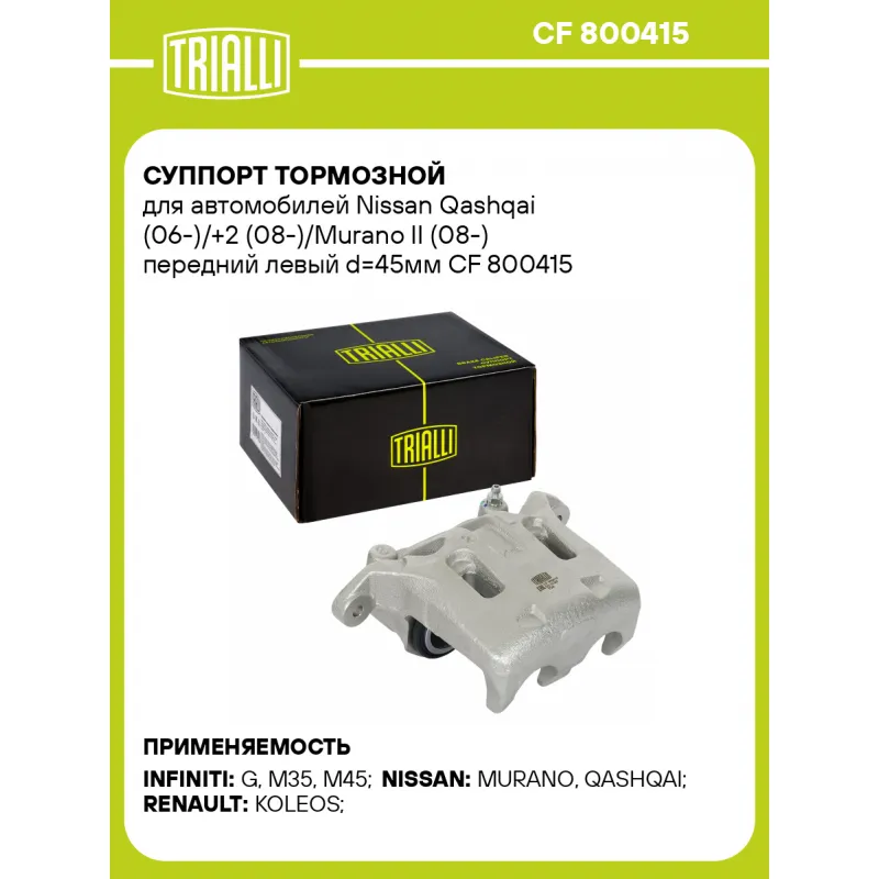 Суппорт тормозной для автомобилей Nissan Qashqai (06-)/+2 (08-)/Murano II (08-) передний левый d=45мм Характеристики: Артикул: CF 800415 OEM номера: 41011 EG50A, 41011 CC00A, 4101 1JY 00A Тормозная система: NISSAN Диаметр, мм: 45 Гарантийный срок: 2 года / 60 000 км Количество поршней: 2 Толщина тормозного диска, мм: 28 Сторона установки: Передняя ось слева Сопутствующий товар: Ремкомплект суппорта: RCF 800415 Сопутствующий товар: Поршень суппорта: RCF 800416 Сопутствующий товар: Скоба суппорта: CF 800417 Сопутствующий товар: Суппорт тормозной: CF 800416 Парный товар: CF 800416 Количество на автомобиль: 1 Товарная линейка: BLACK Комплектация: Скоба дискового тормозного механизма (суппорт тормозной без направляющей колодок) - 1 шт Гарантия: от 1 года.