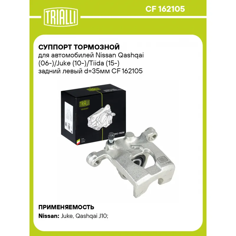 Суппорт тормозной для автомобилей Nissan Qashqai (06-)/Juke (10-)/Tiida (15-) задний левый d=35мм Характеристики: Артикул: CF 162105 OEM номера: 44011EM11A, 440111KD0A Сопутствующий товар: Ремкомплект суппорта: RCF 162105 Сопутствующий товар: Поршень суппорта: RCF 162106 Сопутствующий товар: Скоба суппорта: CF 185169 Сопутствующий товар: Суппорт тормозной: CF 162106 Парный товар: CF 162106 Количество на автомобиль: 1 Диаметр, мм: 35 Количество поршней: 1 Гарантийный срок: 2 года / 60 000 км Толщина тормозного диска, мм: 9 Тормозная система: AKEBONO Сторона установки: Задняя ось слева Товарная линейка: BLACK Подходит для авто: Nissan Juke (10-), Qashqai J10 (06-), Qashqai+2 JJ10 (08-), Cube III Z12 (09-), Tiida (15-), Juke (10-), Qashqai J10 (06-) Для проверки применяемости отправьте VIN автомобиля через вкладку "Есть вопросы о товаре?" Комплектация: Скоба дискового тормозного механизма (суппорт тормозной без направляющей колодок) - 1 шт Гарантия: от 1 года.