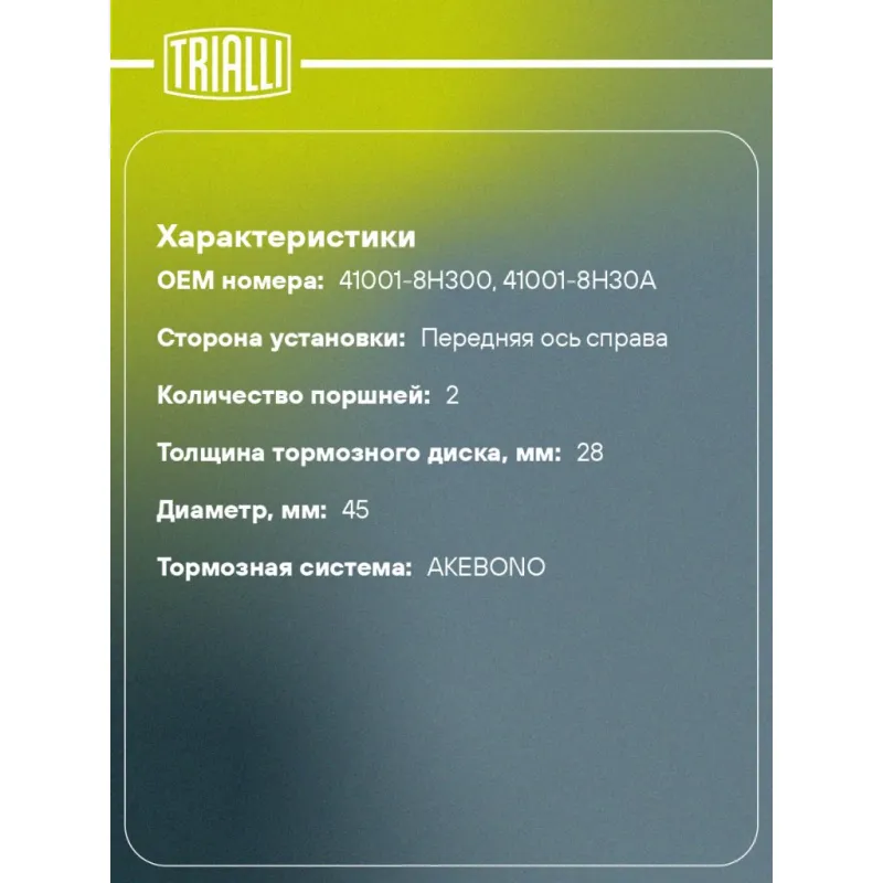 Суппорт тормозной для автомобилей Nissan X-Trail T30 (01-) передний правый d=45мм Характеристики: Артикул: CF 140104 OEM номера: 41001-8H300, 41001-8H30A Сопутствующий товар: Ремкомплект суппорта: RCF 140103 Сопутствующий товар: Поршень суппорта: RCF 140104 Сопутствующий товар: Суппорт тормозной: CF 140103 Парный товар: CF 140103 Количество на автомобиль: 1 Диаметр, мм: 45 Количество поршней: 2 Гарантийный срок: 2 года / 60 000 км Толщина тормозного диска, мм: 28 Тормозная система: AKEBONO Сторона установки: Передняя ось справа Товарная линейка: BLACK Подходит для авто: Nissan X-Trail T30 (01-), X-Trail T30 (01-) Для проверки применяемости отправьте VIN автомобиля через вкладку "Есть вопросы о товаре?" Комплектация: Скоба дискового тормозного механизма (суппорт тормозной без направляющей колодок) - 1 шт Гарантия: от 1 года.