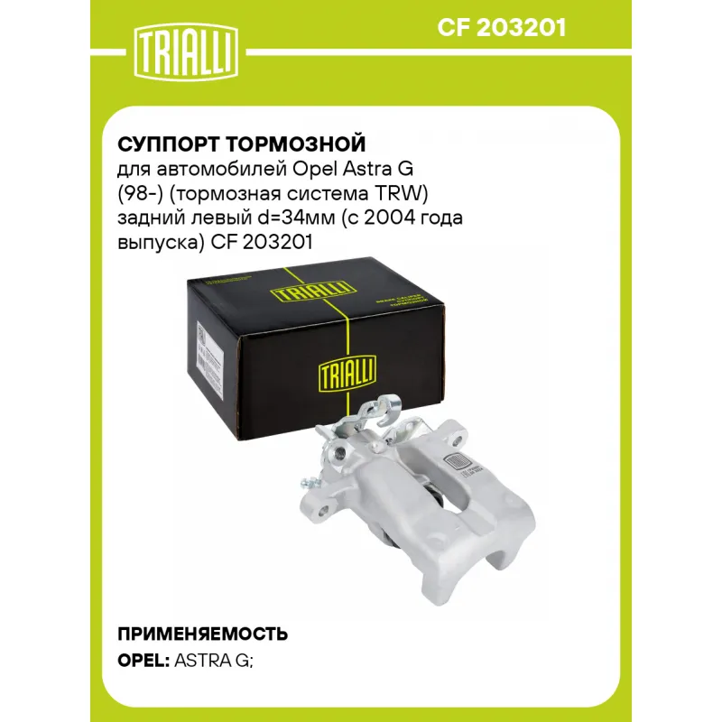 Суппорт тормозной для автомобилей Opel Astra G (98-) (тормозная система TRW) задний левый d=34мм (с 2004 года выпуска) Характеристики: Артикул: CF 203201 OEM номера: 5 42 473, 93179154 Тормозная система: TRW Диаметр, мм: 34 Гарантийный срок: 2 года / 60 000 км Количество поршней: 1 Толщина тормозного диска, мм: 10 Сторона установки: Задняя ось слева Сопутствующий товар: Ремкомплект суппорта: RCF 203201 Сопутствующий товар: Поршень суппорта: RCF 203202 Сопутствующий товар: Скоба суппорта: CF 203203 Сопутствующий товар: Суппорт тормозной: CF 203202 Диаметр тормозного диска, мм: 240 Парный товар: CF 203202 Количество на автомобиль: 1 Товарная линейка: BLACK Комплектация: Скоба дискового тормозного механизма (суппорт тормозной без направляющей колодок) - 1 шт Гарантия: от 1 года.