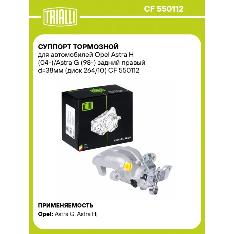 Суппорт тормозной для автомобилей Opel Astra H (04-)/Astra G (98-) задний правый d=38мм (диск 264/10) Характеристики: Артикул: CF 550112 OEM номера: 5 42 106, 5 42 127, 5 42 410, 55 42 464, 93168712, 93179159, 93186061 Сопутствующий товар: Ремкомплект суппорта: RCF 550111 Сопутствующий товар: Поршень суппорта: RCF 550112 Сопутствующий товар: Скоба суппорта: CF 550121 Сопутствующий товар: Суппорт тормозной: CF 550111 Парный товар: CF 550111 Количество на автомобиль: 1 Диаметр, мм: 38 Количество поршней: 1 Гарантийный срок: 2 года / 60 000 км Толщина тормозного диска, мм: 10 Тормозная система: TRW Сторона установки: Задняя ось справа Товарная линейка: BLACK Подходит для авто: Opel Astra G (98-), Astra G (98-), Astra H (04-) Для проверки применяемости отправьте VIN автомобиля через вкладку "Есть вопросы о товаре?" Комплектация: Скоба дискового тормозного механизма (суппорт тормозной без направляющей колодок) - 1 шт Гарантия: от 1 года.