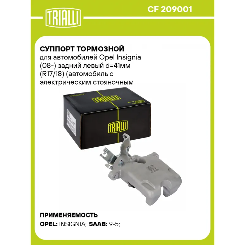 Суппорт тормозной для автомобилей Opel Insignia (08-) задний левый d=41мм (R17/18) (автомобиль с электрическим стояночным тормозом) Характеристики: Артикул: CF 209001 OEM номера: 13275931, 13338349, 13343565, 13370459, 13370467, 5 42 123, 5 42 135, 5 42 173, 5 42 177, 5 42 187, 95522949 Особенности конструкции:: R17/18, автомобиль с электрическим стояночным тормозом Тормозная система: TRW Диаметр, мм: 41 Гарантийный срок: 2 года / 60 000 км Количество поршней: 1 Толщина тормозного диска, мм: 23 Сторона установки: Задняя ось слева Сопутствующий товар: Ремкомплект суппорта: RCF 209001 Сопутствующий товар: Поршень суппорта: RCF 209002 Сопутствующий товар: Скоба суппорта: CF 209003 Сопутствующий товар: Суппорт тормозной: CF 209002 Парный товар: CF 209002 Количество на автомобиль: 1 Товарная линейка: BLACK Комплектация: Скоба дискового тормозного механизма (суппорт тормозной без направляющей колодок) - 1 шт Гарантия: от 1 года.