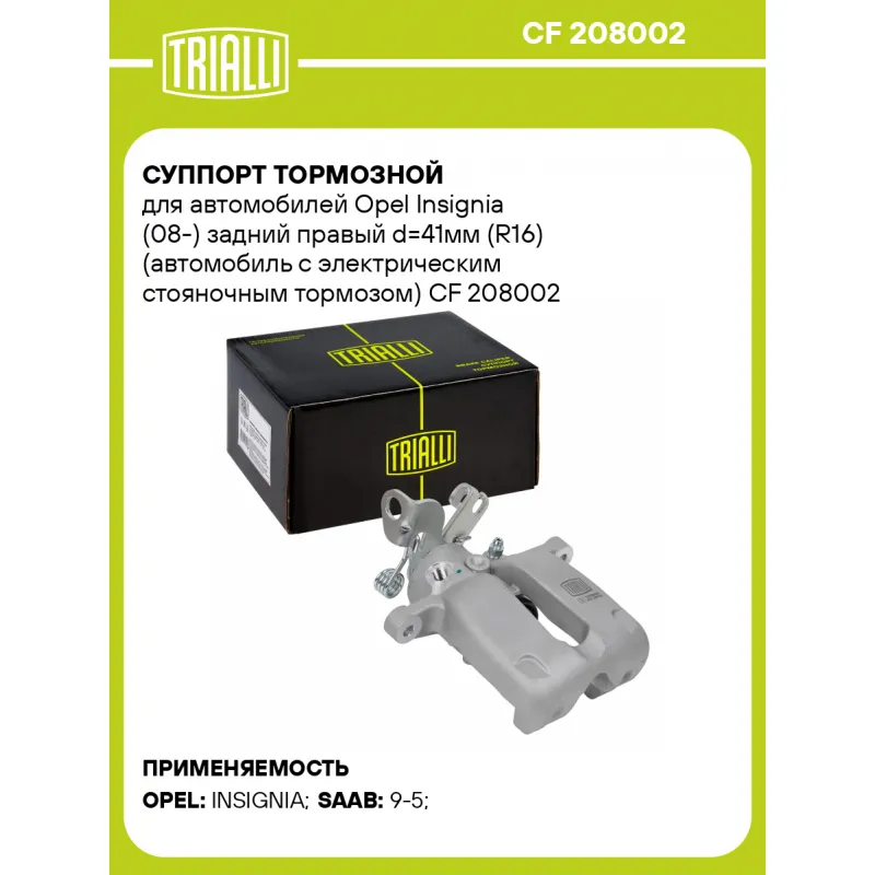 Суппорт тормозной для автомобилей Opel Insignia (08-) задний правый d=41мм (R16) (автомобиль с электрическим стояночным тормозом) Характеристики: Артикул: CF 208002 OEM номера: 13343570, 5 42 169, 5 42 156, 13275928 Особенности конструкции:: R16, автомобиль с электрическим стояночным тормозом Тормозная система: TRW Диаметр, мм: 41 Гарантийный срок: 2 года / 60 000 км Количество поршней: 1 Толщина тормозного диска, мм: 12 Сторона установки: Задняя ось справа Сопутствующий товар: Ремкомплект суппорта: RCF 208001 Сопутствующий товар: Поршень суппорта: RCF 208002 Сопутствующий товар: Скоба суппорта: CF 208003 Сопутствующий товар: Суппорт тормозной: CF 208001 Парный товар: CF 208001 Количество на автомобиль: 1 Товарная линейка: BLACK Комплектация: Скоба дискового тормозного механизма (суппорт тормозной без направляющей колодок) - 1 шт Гарантия: от 1 года.