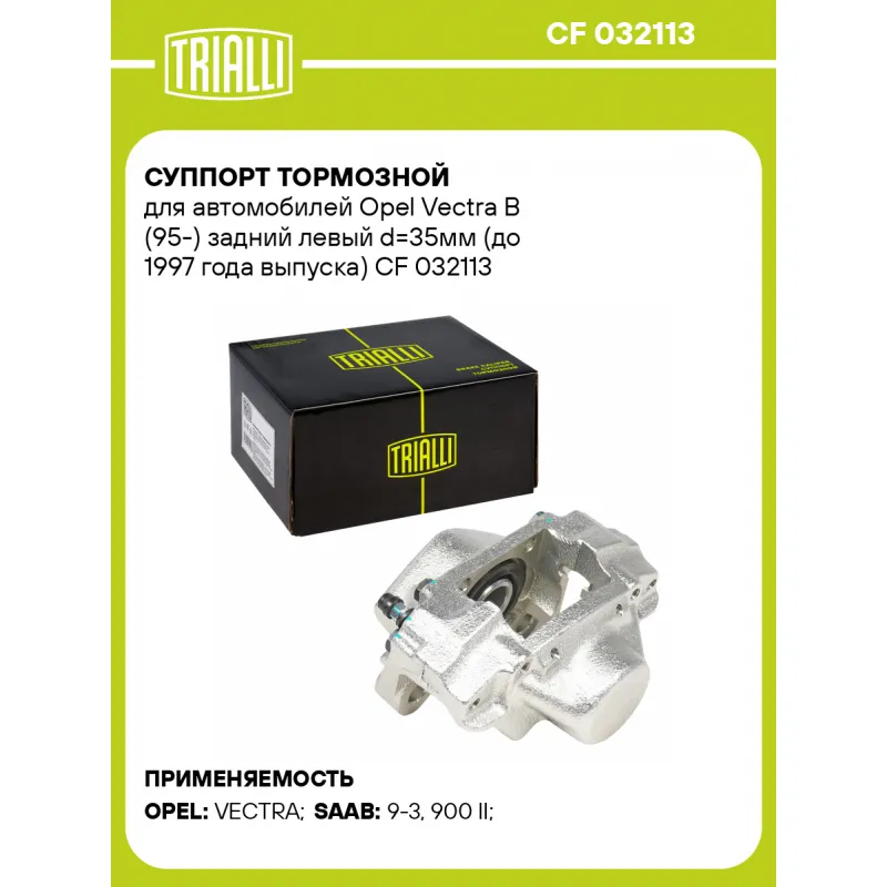 Суппорт тормозной для автомобилей Opel Vectra B (95-) задний левый d=35мм (до 1997 года выпуска) Характеристики: Артикул: CF 032113 OEM номера: 5 42 275, 542327, 4611539, 4838983, 90540170 Гарантийный срок: 2 года / 60 000 км Сопутствующий товар: Ремкомплект суппорта: RCF 032113 Сопутствующий товар: Поршень суппорта: RCF 032114 Сопутствующий товар: Скоба суппорта: CF 800971 Сопутствующий товар: Суппорт тормозной: CF 032114 Парный товар: CF 032114 Количество на автомобиль: 1 Диаметр, мм: 35 Количество поршней: 2 Толщина тормозного диска, мм: 10 Тормозная система: ATE Сторона установки: Задняя ось слева Товарная линейка: BLACK Комплектация: Скоба дискового тормозного механизма (суппорт тормозной без направляющей колодок) - 1 шт Гарантия: от 1 года.