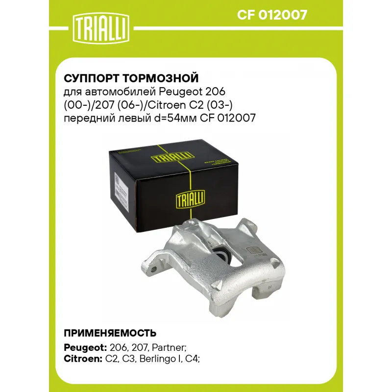 Суппорт тормозной для автомобилей Peugeot 206 (00-)/207 (06-)/Citroen C2 (03-) передний левый d=54мм Характеристики: Артикул: CF 012007 OEM номера: 4400.N0, 4410.67, 4400.R6, 1617292080, 4401N0, 3649084, 441067 Сопутствующий товар: Ремкомплект суппорта: RCF 012007 Сопутствующий товар: Поршень суппорта: RCF 012008 Сопутствующий товар: Суппорт тормозной: CF 012008 Диаметр тормозного диска, мм: 266 Парный товар: CF 012008 Количество на автомобиль: 1 Диаметр, мм: 54 Количество поршней: 1 Гарантийный срок: 2 года / 60 000 км Толщина тормозного диска, мм: 22 Тормозная система: BOSCH Сторона установки: Передняя ось слева Товарная линейка: BLACK Подходит для авто: Peugeot 206 (00-), 207 (06-), 207 (06-), Partner (96-), 207 (06-) Citroen C2 (03-), C3 (10-), C3 (10-), Berlingo I (96-), C4 (04-), C4 (04-) Для проверки применяемости отправьте VIN автомобиля через вкладку "Есть вопросы о товаре?" Комплектация: Скоба дискового тормозного механизма (суппорт тормозной без направляющей колодок) - 1 шт Гарантия: от 1 года.