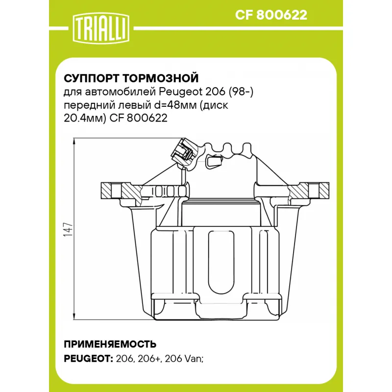 Суппорт тормозной для автомобилей Peugeot 206 (98-) передний левый d=48мм (диск 20.4мм) Характеристики: Артикул: CF 800622 OEM номера: 4400 P0 Тормозная система: BOSCH Диаметр, мм: 48 Гарантийный срок: 2 года / 60 000 км Количество поршней: 1 Толщина тормозного диска, мм: 20.4 Сторона установки: Передняя ось слева Сопутствующий товар: Ремкомплект суппорта: RCF 800622 Сопутствующий товар: Поршень суппорта: RCF 800623 Сопутствующий товар: Скоба суппорта: CF 800624 Сопутствующий товар: Суппорт тормозной: CF 800623 Диаметр тормозного диска, мм: 247 Парный товар: CF 800623 Количество на автомобиль: 1 Товарная линейка: BLACK Комплектация: Скоба дискового тормозного механизма (суппорт тормозной без направляющей колодок) - 1 шт Гарантия: от 1 года.