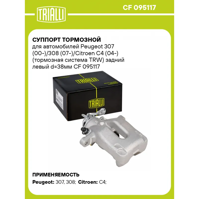 Суппорт тормозной для автомобилей Peugeot 307 (00-)/308 (07-)/Citroen C4 (04-) (тормозная система TRW) задний левый d=38мм Характеристики: Артикул: CF 095117 OEM номера: 1607375680 Сопутствующий товар: Ремкомплект суппорта: RCF 095117 Сопутствующий товар: Поршень суппорта: RCF 095118 Сопутствующий товар: Суппорт тормозной: CF 095118 Парный товар: CF 095118 Количество на автомобиль: 1 Диаметр, мм: 38 Количество поршней: 1 Гарантийный срок: 2 года / 60 000 км Толщина тормозного диска, мм: 9 Тормозная система: TRW Сторона установки: Задняя ось слева Товарная линейка: BLACK Подходит для авто: Peugeot 307 (00-), 308 (13-), 308 (07-), 308 (07-), 308 (13-), 308 (07-) Citroen C4 (04-), C4 (04-), C4 (10-), C4 (10-) Для проверки применяемости отправьте VIN автомобиля через вкладку "Есть вопросы о товаре?" Комплектация: Скоба дискового тормозного механизма (суппорт тормозной без направляющей колодок) - 1 шт Гарантия: от 1 года.