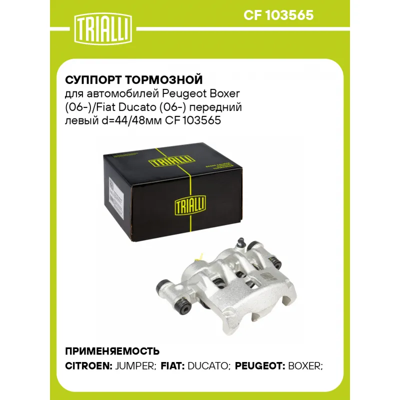 Суппорт тормозной для автомобилей Peugeot Boxer (06-)/Fiat Ducato (06-) передний левый d=44/48мм Характеристики: Артикул: CF 103565 OEM номера: 4401 J6, 71793156, 77364042 Гарантийный срок: 2 года / 60 000 км Сопутствующий товар: Ремкомплект суппорта: RCF 103565 Сопутствующий товар: Поршень суппорта: RCF 103566, RCF 103566B Сопутствующий товар: Скоба суппорта: CF 800955 Сопутствующий товар: Суппорт тормозной: CF 103566 Парный товар: CF 103566 Количество на автомобиль: 1 Диаметр, мм: 44/48 Количество поршней: 2 Толщина тормозного диска, мм: 24 Тормозная система: BREMBO Сторона установки: Передняя ось слева Товарная линейка: BLACK Комплектация: Скоба дискового тормозного механизма (суппорт тормозной без направляющей колодок) - 1 шт Гарантия: от 1 года.