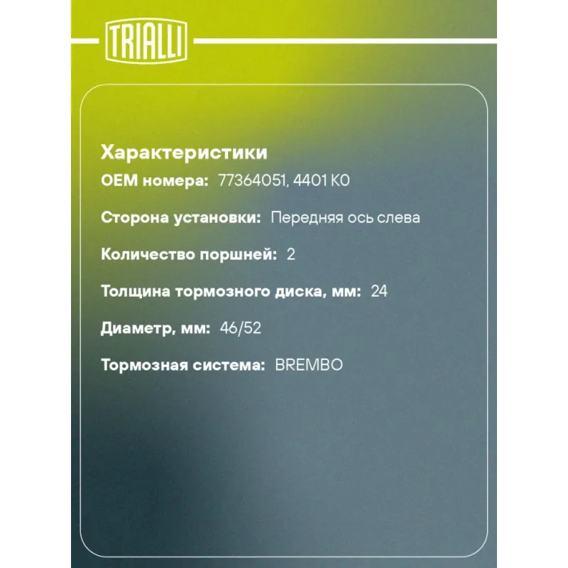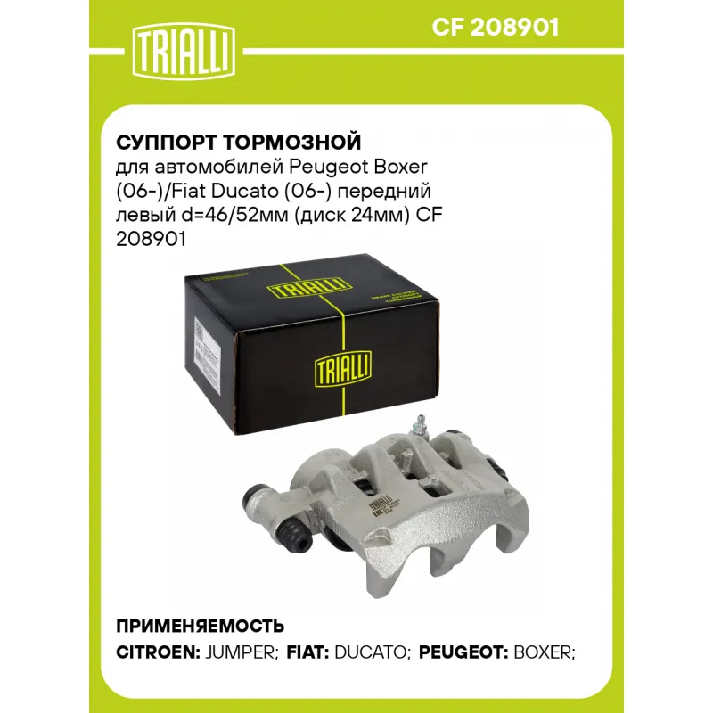 Суппорт тормозной для автомобилей Peugeot Boxer (06-)/Fiat Ducato (06-) передний левый d=46/52мм (диск 24мм) Характеристики: Артикул: CF 208901 OEM номера: 77364051, 4401 K0 Тормозная система: BREMBO Диаметр, мм: 46/52 Гарантийный срок: 2 года / 60 000 км Количество поршней: 2 Толщина тормозного диска, мм: 24 Сторона установки: ... Читать полностью →