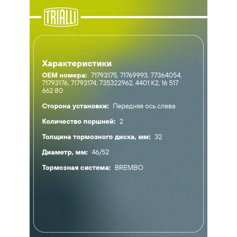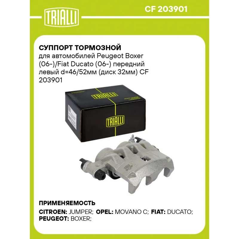 Суппорт тормозной для автомобилей Peugeot Boxer (06-)/Fiat Ducato (06-) передний левый d=46/52мм (диск 32мм) Характеристики: Артикул: CF 203901 OEM номера: 71793175, 71769993, 77364054, 71793176, 71793174, 735322962, 4401 K2, 16 517 662 80 Тормозная система: BREMBO Диаметр, мм: 46/52 Гарантийный срок: 2 года / 60 000 км Количество поршней: 2 Толщина тормозного диска, мм: 32 Сторона установки: Передняя ось слева Парный товар: CF 203902 Количество на автомобиль: 1 Товарная линейка: BLACK Комплектация: Скоба дискового тормозного механизма (суппорт тормозной без направляющей колодок) - 1 шт Гарантия: от 1 года.