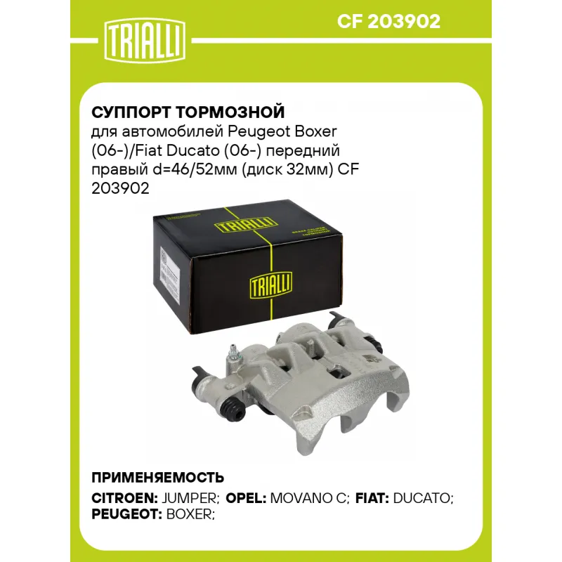 Суппорт тормозной для автомобилей Peugeot Boxer (06-)/Fiat Ducato (06-) передний правый d=46/52мм (диск 32мм) Характеристики: Артикул: CF 203902 OEM номера: 77364055, 71793179, 51885311, 71793177, 735322963, 77365935, 71793178, 16 517 672 80, 16 078 768 80, 4401 K3 Тормозная система: BREMBO Диаметр, мм: 46/52 Гарантийный срок: 2 года / 60 000 км Количество поршней: 2 Толщина тормозного диска, мм: 32 Сторона установки: Передняя ось справа Парный товар: CF 203901 Количество на автомобиль: 1 Товарная линейка: BLACK Комплектация: Скоба дискового тормозного механизма (суппорт тормозной без направляющей колодок) - 1 шт Гарантия: от 1 года.