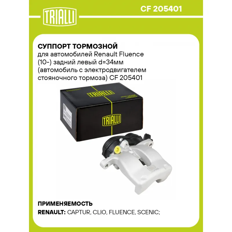 Суппорт тормозной для автомобилей Renault Fluence (10-) задний левый d=34мм (автомобиль с электродвигателем стояночного тормоза) Характеристики: Артикул: CF 205401 OEM номера: 4401 106 75R Особенности конструкции:: Для автомобилей с электрическим стояночным тормозом Тормозная система: TRW Диаметр, мм: 34 Гарантийный срок: 2 года / 60 000 км Количество поршней: 1 Толщина тормозного диска, мм: 8 Сторона установки: Задняя ось слева Сопутствующий товар: Ремкомплект суппорта: RCF 205401 Сопутствующий товар: Поршень суппорта: RCF 205402 Сопутствующий товар: Скоба суппорта: CF 205403 Сопутствующий товар: Электродвигатель суппорта: RCM 205401 Сопутствующий товар: Суппорт тормозной: CF 205402 Парный товар: CF 205402 Количество на автомобиль: 1 Товарная линейка: BLACK Комплектация: Скоба дискового тормозного механизма (суппорт тормозной без направляющей колодок) - 1 шт Гарантия: от 1 года.