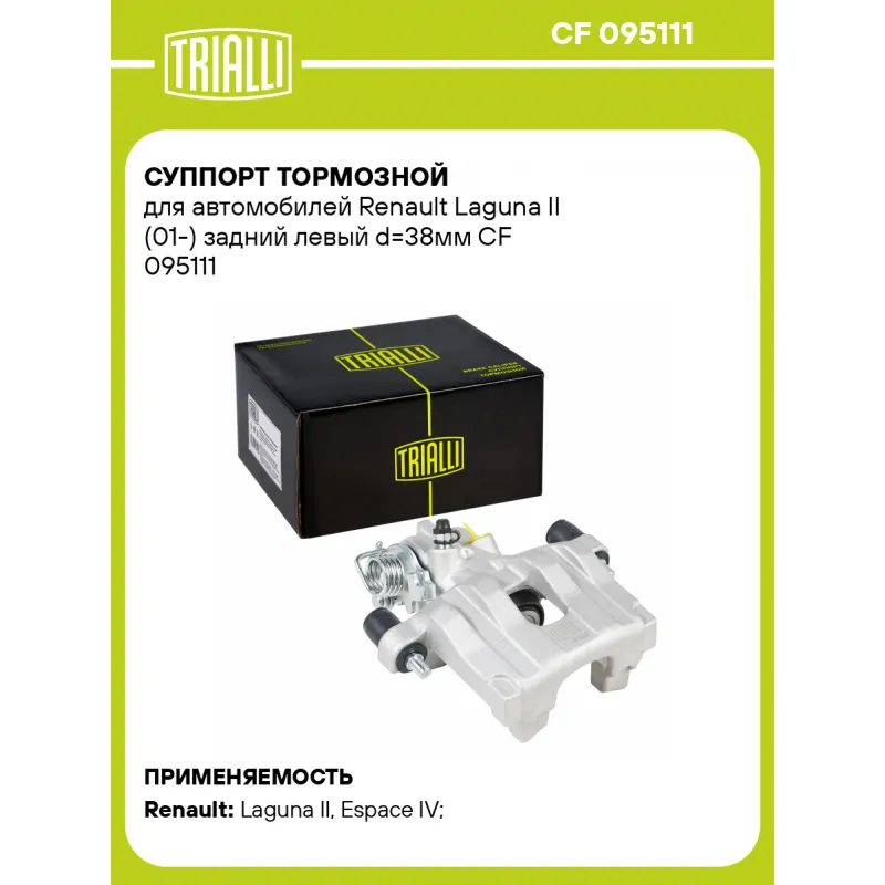 Суппорт тормозной для автомобилей Renault Laguna II (01-) задний левый d=38мм Характеристики: Артикул: CF 095111 OEM номера: 7701049108, 7711135695 Сопутствующий товар: Ремкомплект суппорта: RCF 095112 Сопутствующий товар: Поршень суппорта: CF 012111 Сопутствующий товар: Скоба суппорта: CF 095112 Сопутствующий товар: Суппорт тормозной: RCF 095111 Парный товар: CF 095112 Количество на автомобиль: 1 Диаметр, мм: 38 Количество поршней: 1 Гарантийный срок: 2 года / 60 000 км Толщина тормозного диска, мм: 8 Тормозная система: ATE Сторона установки: Задняя ось слева Товарная линейка: BLACK Подходит для авто: Renault Laguna II (01-), Laguna II (01-), Espace IV (02-) Для проверки применяемости отправьте VIN автомобиля через вкладку "Есть вопросы о товаре?" Комплектация: Скоба дискового тормозного механизма (суппорт тормозной без направляющей колодок) - 1 шт Гарантия: от 1 года.