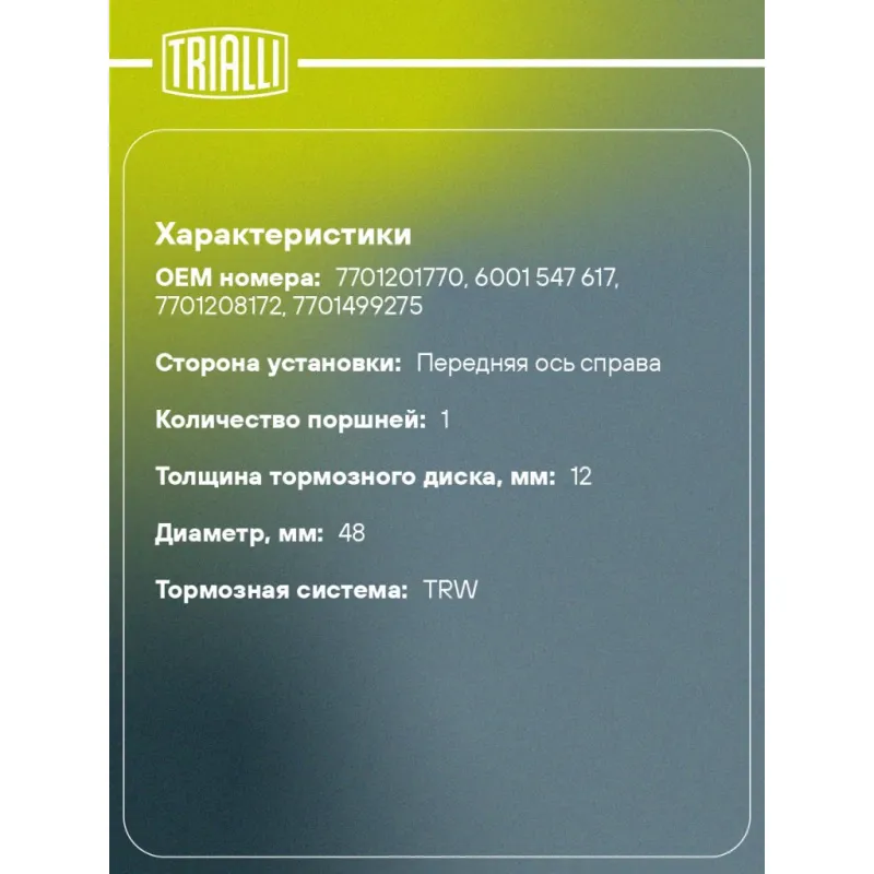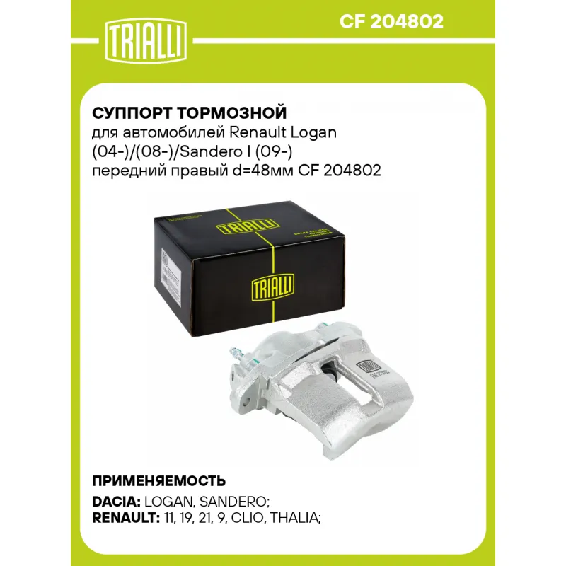 Суппорт тормозной для автомобилей Renault Logan (04-)/(08-)/Sandero I (09-) передний правый d=48мм Характеристики: Артикул: CF 204802 OEM номера: 7701201770, 6001 547 617, 7701208172, 7701499275 Тормозная система: TRW Диаметр, мм: 48 Гарантийный срок: 2 года / 60 000 км Количество поршней: 1 Толщина тормозного диска, мм: 12 Сторона установки: Передняя ось справа Сопутствующий товар: Ремкомплект суппорта: RCF 204801 Сопутствующий товар: Поршень суппорта: RCF 204802 Сопутствующий товар: Скоба суппорта: CF 204803 Сопутствующий товар: Суппорт тормозной: CF 204801 Парный товар: CF 204801 Количество на автомобиль: 1 Товарная линейка: BLACK Комплектация: Скоба дискового тормозного механизма (суппорт тормозной без направляющей колодок) - 1 шт Гарантия: от 1 года.