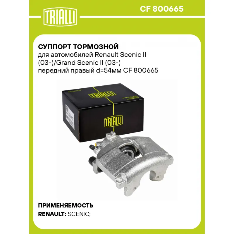 Суппорт тормозной для автомобилей Renault Scenic II (03-)/Grand Scenic II (03-) передний правый d=54мм Характеристики: Артикул: CF 800665 OEM номера: 7701 065 279, 41 00 131 70R Тормозная система: ATE Диаметр, мм: 54 Гарантийный срок: 2 года / 60 000 км Количество поршней: 1 Толщина тормозного диска, мм: 24 Сторона установки: Передняя ось справа Сопутствующий товар: Ремкомплект суппорта: RCF 800664 Сопутствующий товар: Поршень суппорта: RCF 800665 Сопутствующий товар: Скоба суппорта: CF 800666 Сопутствующий товар: Суппорт тормозной: CF 800664 Диаметр тормозного диска, мм: 300 Парный товар: CF 800664 Количество на автомобиль: 1 Товарная линейка: BLACK Комплектация: Скоба дискового тормозного механизма (суппорт тормозной без направляющей колодок) - 1 шт Гарантия: от 1 года.