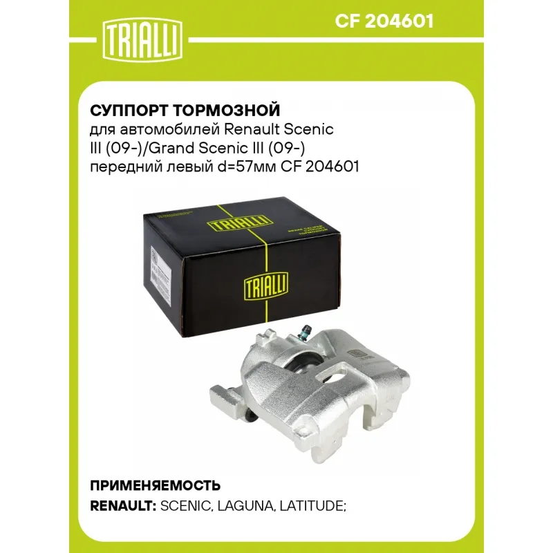 Суппорт тормозной для автомобилей Renault Scenic III (09-)/Grand Scenic III (09-) передний левый d=57мм Характеристики: Артикул: CF 204601 OEM номера: 4101 100 01R Тормозная система: ATE Диаметр, мм: 57 Гарантийный срок: 2 года / 60 000 км Количество поршней: 1 Толщина тормозного диска, мм: 26 Сторона установки: Передняя ось слева Сопутствующий товар: Ремкомплект суппорта: RCF 204601 Сопутствующий товар: Поршень суппорта: RCF 204602 Сопутствующий товар: Скоба суппорта: CF 204603 Сопутствующий товар: Суппорт тормозной: CF 204602 Парный товар: CF 204602 Количество на автомобиль: 1 Товарная линейка: BLACK Комплектация: Скоба дискового тормозного механизма (суппорт тормозной без направляющей колодок) - 1 шт Гарантия: от 1 года.