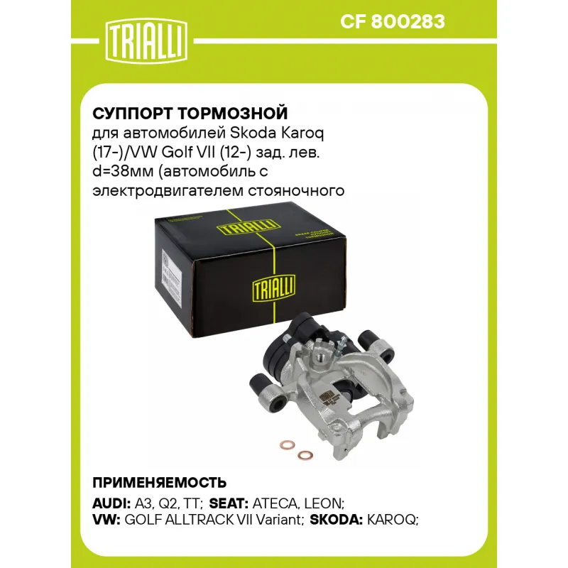 Суппорт тормозной для автомобилей Skoda Karoq (17-)/VW Golf VII (12-) зад. лев. d=38мм (автомобиль с электродвигателем стояночного тормоза) Характеристики: Артикул: CF 800283 OEM номера: 8V0 615 423, 8V0 615 423 D, 8V0 615 423 DX Особенности конструкции:: Для автомобилей с электрическим стояночным тормозом Тормозная система: ATE Диаметр, мм: 38 Гарантийный срок: 2 года / 60 000 км Количество поршней: 1 Толщина тормозного диска, мм: 10 Сторона установки: Задняя ось слева Парный товар: CF 800284 Количество на автомобиль: 1 Товарная линейка: BLACK Комплектация: Скоба дискового тормозного механизма (суппорт тормозной без направляющей колодок) - 1 шт Гарантия: от 1 года.