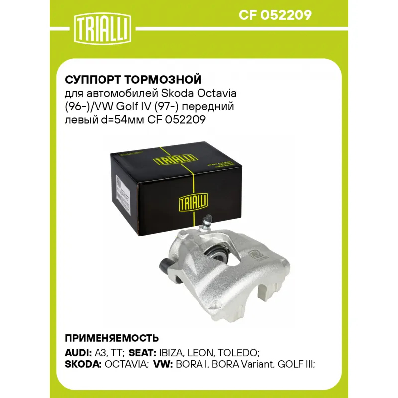 Суппорт тормозной для автомобилей Skoda Octavia (96-)/VW Golf IV (97-) передний левый d=54мм Характеристики: Артикул: CF 052209 OEM номера: 1J0 615 123 B, 1J0 615 123 C, 1J0 615 123 D, 3A0 615 123, 8N0 615 123, 1U0 615 123 Гарантийный срок: 2 года / 60 000 км Сопутствующий товар: Ремкомплект суппорта: RCF 052209 Сопутствующий товар: Поршень суппорта: RCF 052210 Сопутствующий товар: Скоба суппорта: CF 052109 Сопутствующий товар: Суппорт тормозной: CF 052210 Парный товар: CF 052210 Количество на автомобиль: 1 Диаметр, мм: 54 Количество поршней: 1 Толщина тормозного диска, мм: 25 Тормозная система: ATE Сторона установки: Передняя ось слева Товарная линейка: BLACK Комплектация: Скоба дискового тормозного механизма (суппорт тормозной без направляющей колодок) - 1 шт Гарантия: от 1 года.