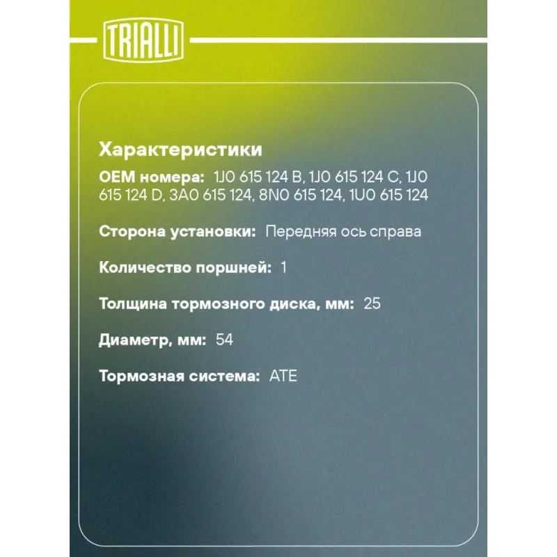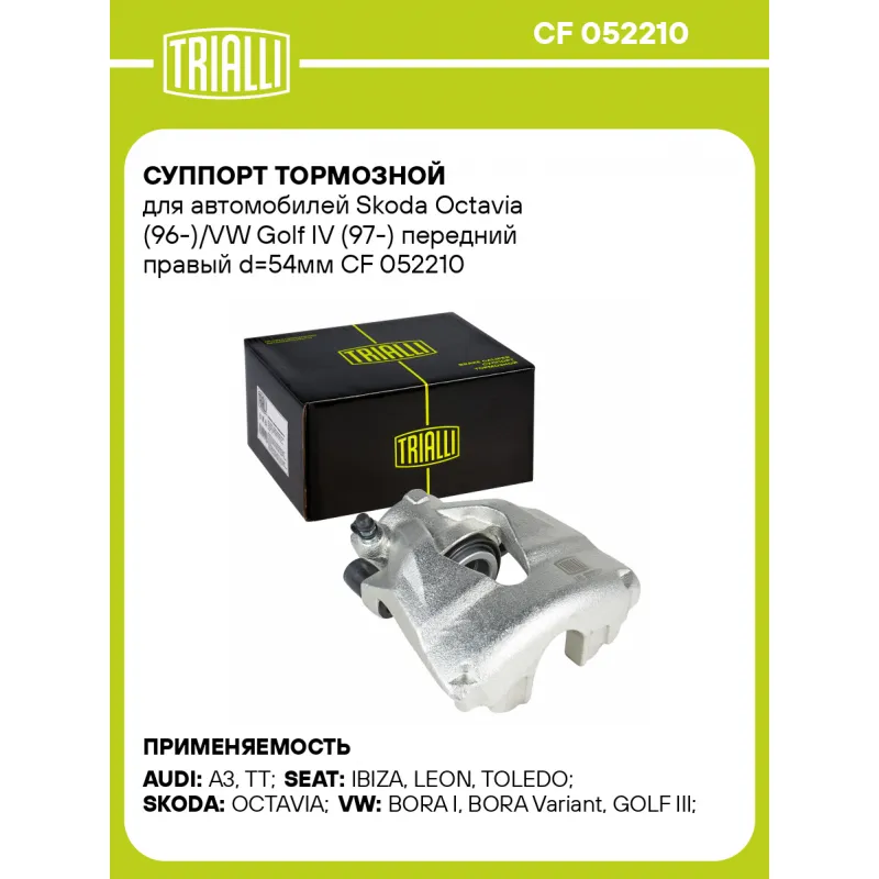 Суппорт тормозной для автомобилей Skoda Octavia (96-)/VW Golf IV (97-) передний правый d=54мм Характеристики: Артикул: CF 052210 OEM номера: 1J0 615 124 B, 1J0 615 124 C, 1J0 615 124 D, 3A0 615 124, 8N0 615 124, 1U0 615 124 Гарантийный срок: 2 года / 60 000 км Сопутствующий товар: Ремкомплект суппорта: RCF 052209 Сопутствующий товар: Поршень суппорта: RCF 052210 Сопутствующий товар: Скоба суппорта: CF 052109 Сопутствующий товар: Суппорт тормозной: CF 052209 Парный товар: CF 052209 Количество на автомобиль: 1 Диаметр, мм: 54 Количество поршней: 1 Толщина тормозного диска, мм: 25 Тормозная система: ATE Сторона установки: Передняя ось справа Товарная линейка: BLACK Комплектация: Скоба дискового тормозного механизма (суппорт тормозной без направляющей колодок) - 1 шт Гарантия: от 1 года.