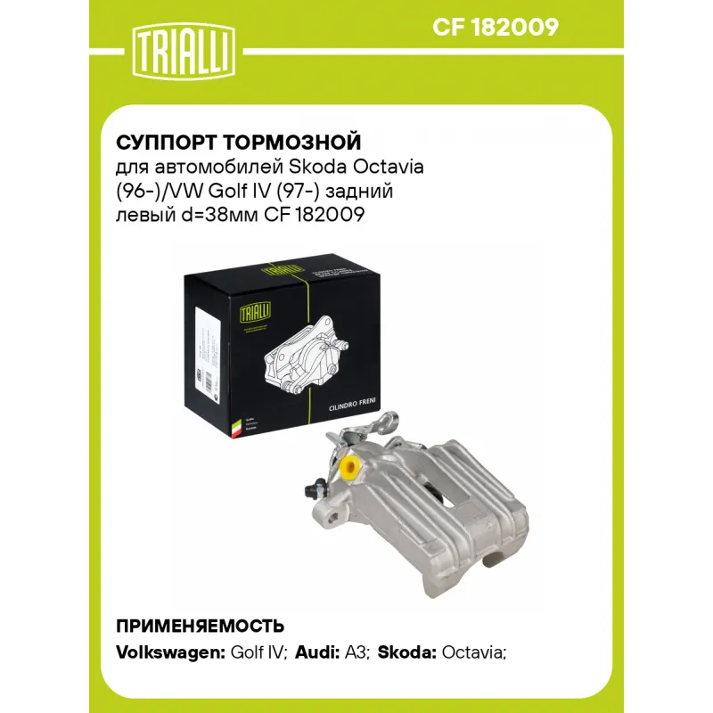 Суппорт тормозной для автомобилей Skoda Octavia (96-)/VW Golf IV (97-) задний левый d=38мм Характеристики: Артикул: CF 182009 OEM номера: 1J0615423, 8N0615423 Сопутствующий товар: Ремкомплект суппорта: RCF 182009 Сопутствующий товар: Поршень суппорта: RCF 182010 Сопутствующий товар: Суппорт тормозной: CF 182010 Парный товар: CF 182010 Количество на автомобиль: 1 Диаметр, мм: 38 Количество поршней: 1 Гарантийный срок: 2 года / 60 000 км Толщина тормозного диска, мм: 9 Тормозная система: TRW Сторона установки: Задняя ось слева Товарная линейка: BLACK Подходит для авто: Volkswagen Golf IV (97-), Golf IV (97-) Audi A3 (03-), A3 (03-) Skoda Octavia (96-) Для проверки применяемости отправьте VIN автомобиля через вкладку "Есть вопросы о товаре?" Комплектация: Скоба дискового тормозного механизма (суппорт тормозной без направляющей колодок) - 1 шт Гарантия: от 1 года.