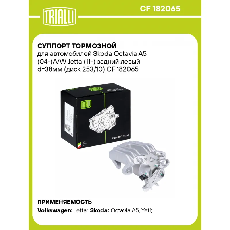 Суппорт тормозной для автомобилей Skoda Octavia A5 (04-)/VW Jetta (11-) задний левый d=38мм (диск 253/10) Характеристики: Артикул: CF 182065 OEM номера: 1K0 615 423 Q, 1K0 615 423 D, 1K0 615 423 J, 1K0 615 423 A Сопутствующий товар: Ремкомплект суппорта: RCF 182065 Сопутствующий товар: Поршень суппорта: RCF 182066 Сопутствующий товар: Скоба суппорта: CF 190619 Сопутствующий товар: Суппорт тормозной: CF 182066 Количество на автомобиль: 1 Диаметр, мм: 38 Количество поршней: 1 Гарантийный срок: 2 года / 60 000 км Толщина тормозного диска, мм: 10 Тормозная система: TRW Сторона установки: Задняя ось слева Товарная линейка: BLACK Подходит для авто: Volkswagen Jetta (11-) Skoda Octavia A5 (04-), Yeti (09-), Octavia A5 (04-), Yeti (09-) Для проверки применяемости отправьте VIN автомобиля через вкладку "Есть вопросы о товаре?" Комплектация: Скоба дискового тормозного механизма (суппорт тормозной без направляющей колодок) - 1 шт Гарантия: от 1 года.