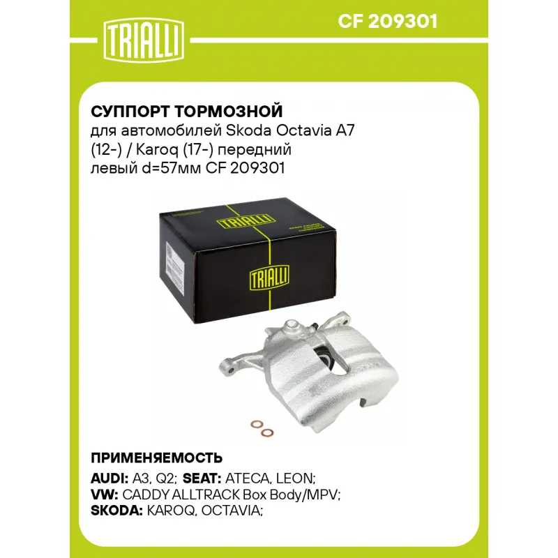Суппорт тормозной для автомобилей Skoda Octavia A7 (12-) / Karoq (17-) передний левый d=57мм Характеристики: Артикул: CF 209301 OEM номера: 8V0 615 123, 1S0 615 123 Тормозная система: TRW Диаметр, мм: 57 Гарантийный срок: 2 года / 60 000 км Количество поршней: 1 Толщина тормозного диска, мм: 25 Сторона установки: Передняя ось сл... Читать полностью →