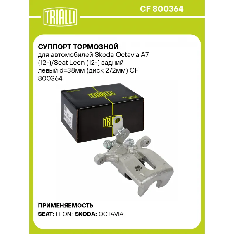 Суппорт тормозной для автомобилей Skoda Octavia A7 (12-)/Seat Leon (12-) задний левый d=38мм (диск 272мм) Характеристики: Артикул: CF 800364 OEM номера: 5Q0 615 423 B, 5QM 615 423 A Тормозная система: TRW Диаметр, мм: 38 Гарантийный срок: 2 года / 60 000 км Количество поршней: 1 Толщина тормозного диска, мм: 10 Сторона установки... Читать полностью →