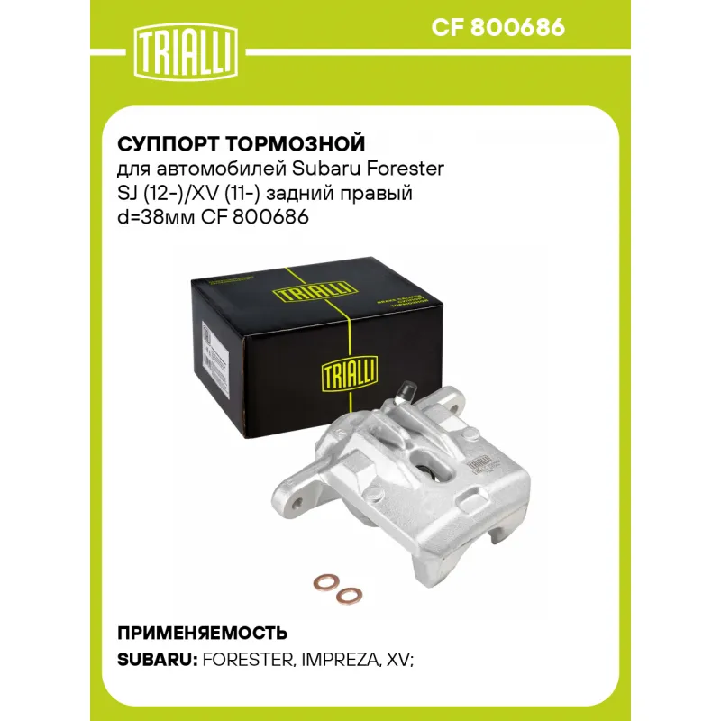 Суппорт тормозной для автомобилей Subaru Forester SJ (12-)/XV (11-) задний правый d=38мм Характеристики: Артикул: CF 800686 OEM номера: 26692FJ000 Тормозная система: TOKICO Диаметр, мм: 38 Гарантийный срок: 2 года / 60 000 км Количество поршней: 1 Толщина тормозного диска, мм: 10 Сторона установки: Задняя ось справа Сопутствующий товар: Ремкомплект суппорта: RCF 800685 Сопутствующий товар: Поршень суппорта: RCF 800686 Сопутствующий товар: Скоба суппорта: CF 800687 Сопутствующий товар: Суппорт тормозной: CF 800685 Диаметр тормозного диска, мм: 274 Парный товар: CF 800685 Количество на автомобиль: 1 Товарная линейка: BLACK Комплектация: Скоба дискового тормозного механизма (суппорт тормозной без направляющей колодок) - 1 шт Гарантия: от 1 года.