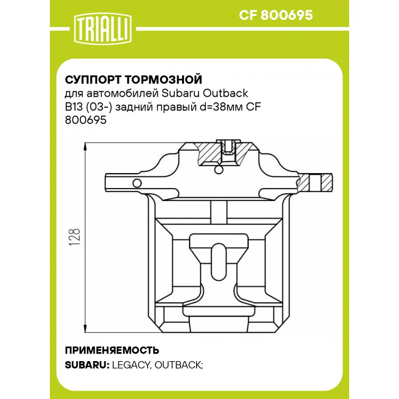 Суппорт тормозной для автомобилей Subaru Outback B13 (03-) задний правый d=38мм Характеристики: Артикул: CF 800695 OEM номера: 26692AG060, 26692AG061 Тормозная система: TOKICO Диаметр, мм: 38 Гарантийный срок: 2 года / 60 000 км Количество поршней: 1 Толщина тормозного диска, мм: 10 Сторона установки: Задняя ось справа Сопутствующий товар: Ремкомплект суппорта: RCF 800694 Сопутствующий товар: Поршень суппорта: RCF 800695 Сопутствующий товар: Скоба суппорта: CF 800696 Сопутствующий товар: Суппорт тормозной: CF 800694 Диаметр тормозного диска, мм: 273/286 Парный товар: CF 800694 Количество на автомобиль: 1 Товарная линейка: BLACK Комплектация: Скоба дискового тормозного механизма (суппорт тормозной без направляющей колодок) - 1 шт Гарантия: от 1 года.