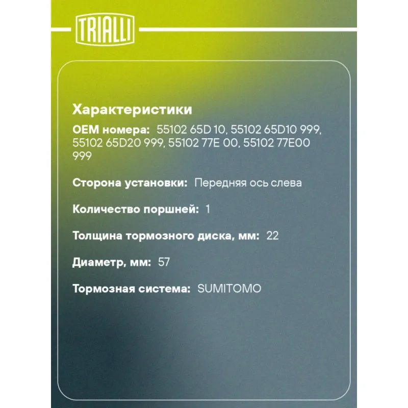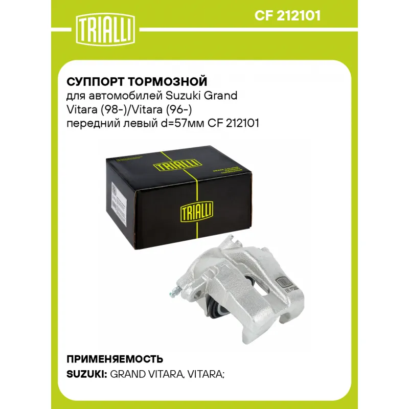 Суппорт тормозной для автомобилей Suzuki Grand Vitara (98-)/Vitara (96-) передний левый d=57мм Характеристики: Артикул: CF 212101 OEM номера: 55102 65D 10, 55102 65D10 999, 55102 65D20 999, 55102 77E 00, 55102 77E00 999 Тормозная система: SUMITOMO Диаметр, мм: 57 Гарантийный срок: 2 года / 60 000 км Количество поршней: 1 Толщина тормозного диска, мм: 22 Сторона установки: Передняя ось слева Сопутствующий товар: Ремкомплект суппорта: RCF 212101 Сопутствующий товар: Поршень суппорта: RCF 212102 Сопутствующий товар: Скоба суппорта: CF 212103 Сопутствующий товар: Суппорт тормозной: CF 212102 Парный товар: CF 212102 Количество на автомобиль: 1 Товарная линейка: BLACK Комплектация: Скоба дискового тормозного механизма (суппорт тормозной без направляющей колодок) - 1 шт Гарантия: от 1 года.